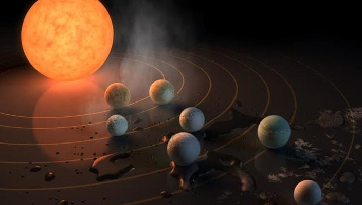 Un equipo internacional de astrónomos ha descubierto un nuevo sistema solar con siete planetas del tamaño de la Tierra. Está a unos 40 años luz de nosotros, en torno a una estrella tenue y fría. Todos tienen un tamaño similar a la Tierra, pero están mucho más cerca de su débil estrella, lo que les permitiría albergar agua líquida, condición esencial para la vida. Los tres primeros están demasiado cerca de la estrella, con lo que probablemente tienen climas